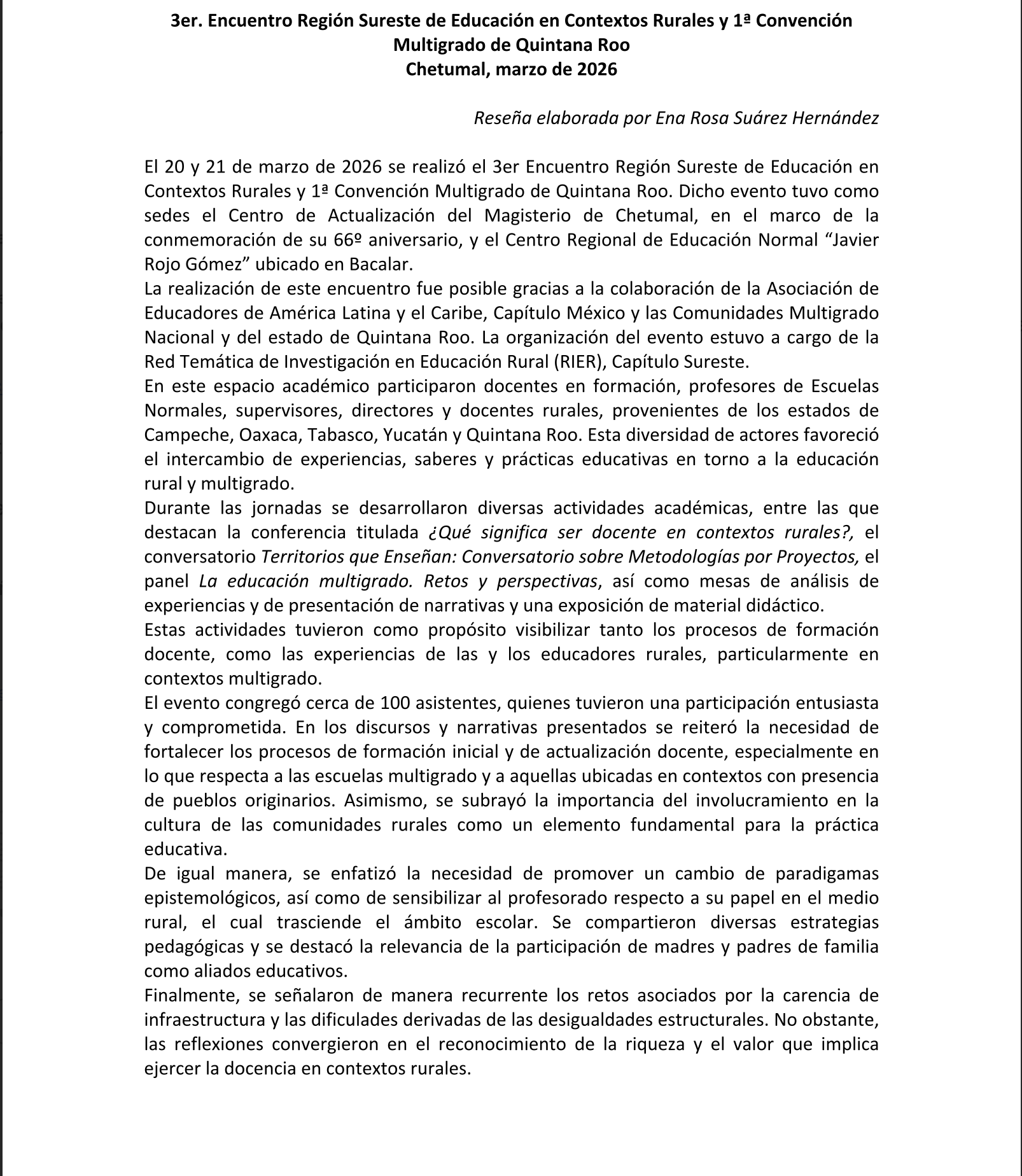 3er. Encuentro Región Sureste de Educación en Contextos Rurales Quintana Roo, 20 y 21 de marzo de 2026 23 Mar 26 Compartir: