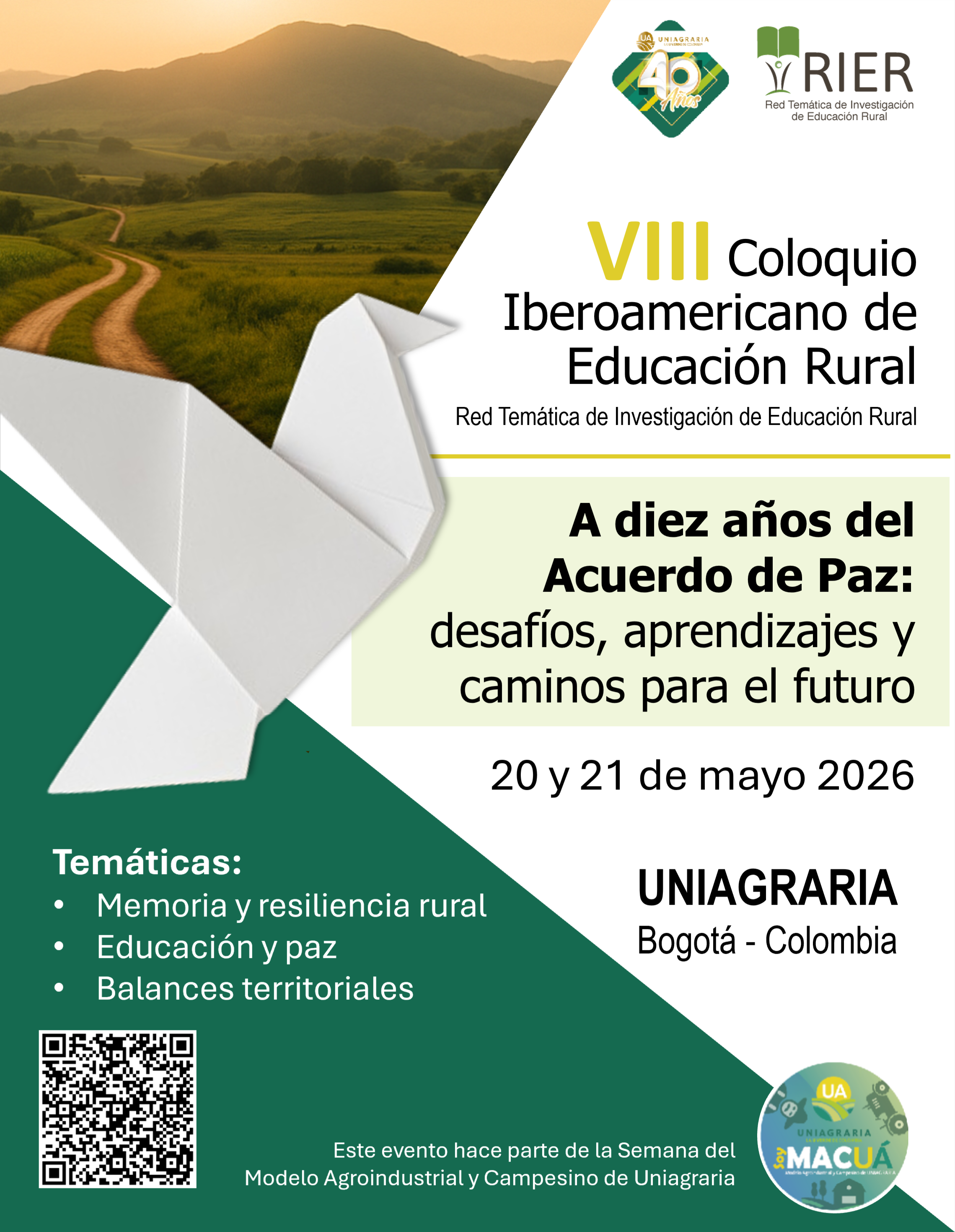 Este encuentro se desarrollará con el propósito de propiciar un diálogo profundo y plural alrededor del décimo aniversario de la firma del Acuerdo de Paz en Colombia, explorando los avances, desafíos y aprendizajes en la paz territorial, la educación rural y la Reforma Rural Integral, desde la interacción entre academia, comunidades, instituciones y sectores productivos.